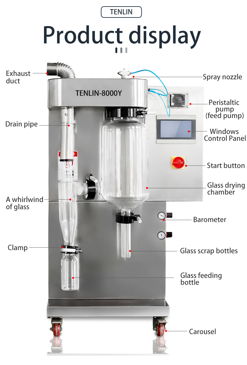 Introduction: The machine works by passing air through a filter and heating device before entering a hot air distributor at the top of the drying chamber. The hot air is evenly distributed within the chamber and rotates in a spiral pattern, simultaneously delivering the liquid material to a centrifugal spray head located at the top of the chamber. The liquid material is atomized into fine droplets, significantly increasing the surface area of contact between the liquid material and the hot air, causing rapid evaporation of moisture and drying the finished product in a very short time. Coarser pieces of the finished product are collected in a collection cylinder at the bottom of the dryer, and exhaust gas is discharged by a centrifugal fan.